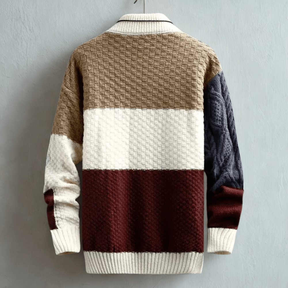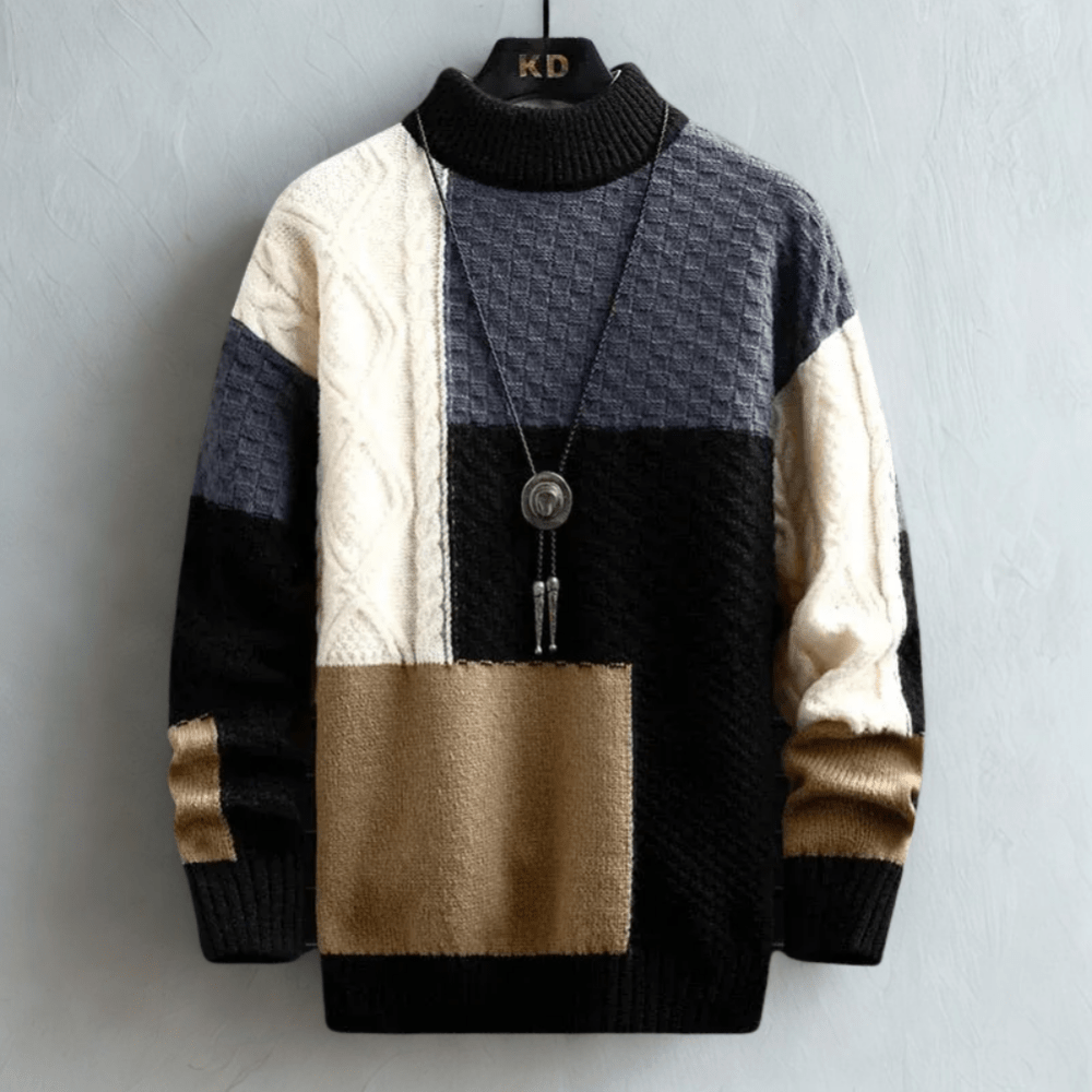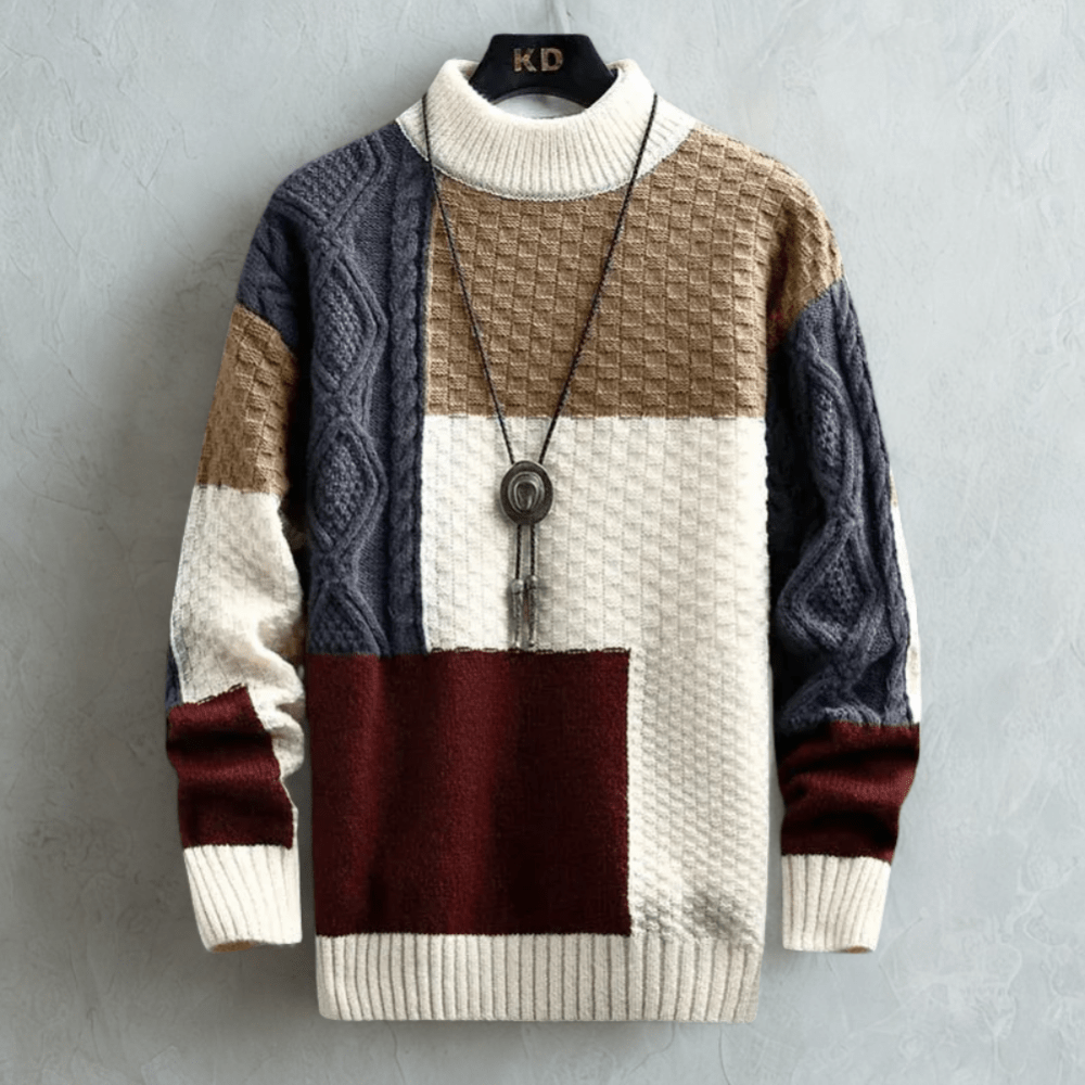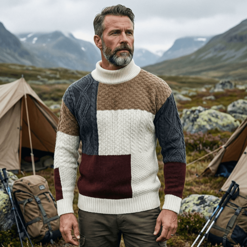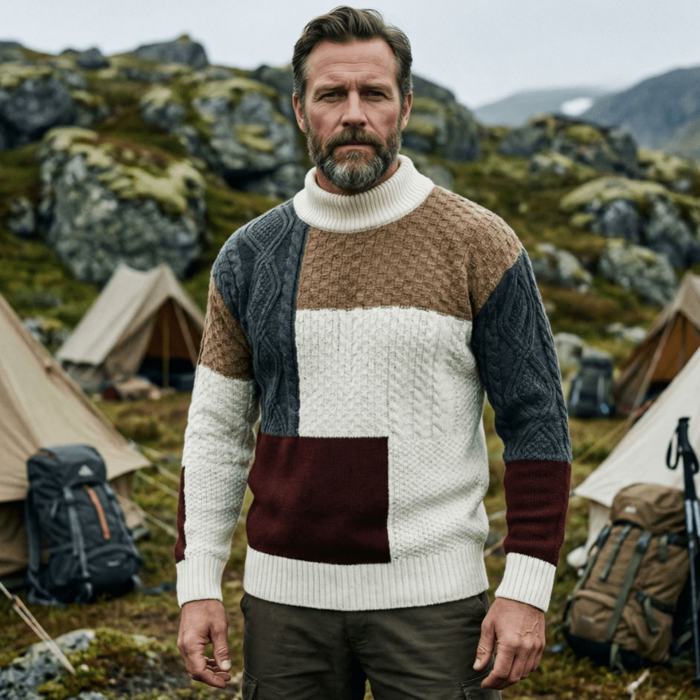 Inspirert av det robuste skandinaviske landskapet kombinerer denne patchwork-poloen klassisk varme med moderne stil i ett iøynefallende plagg. Blandingen av dype farger og ulike strikkemønstre gir genseren et håndverksmessig uttrykk, mens den høye halsen gir ekstra beskyttelse mot kald vind.