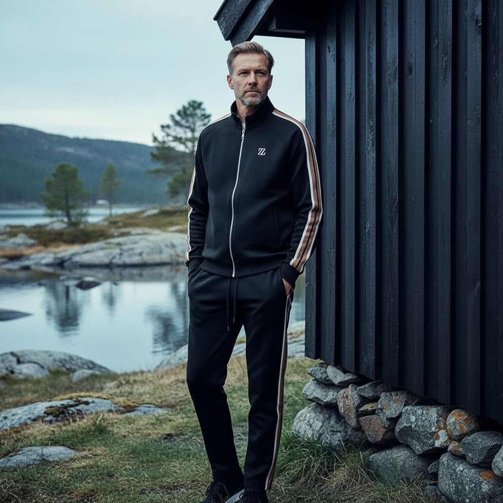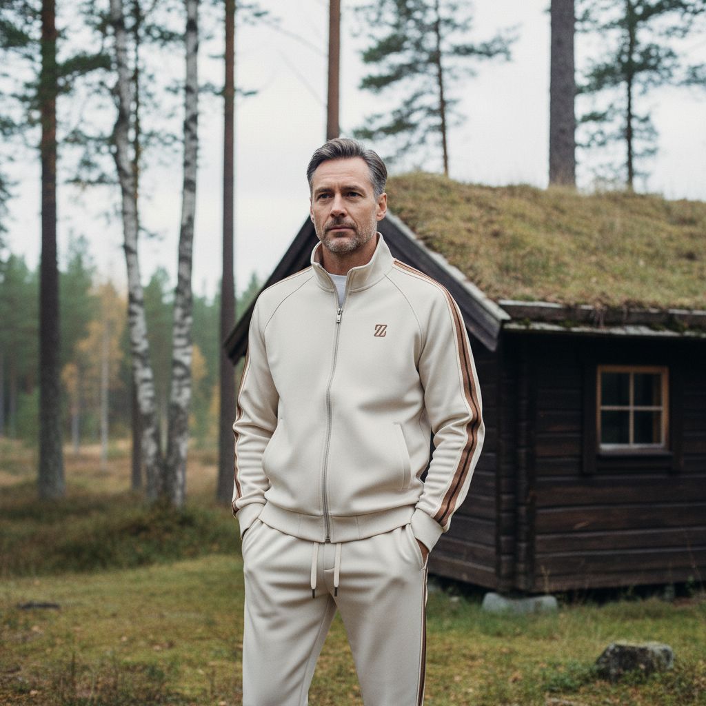 Den glidelåslukkede jakken passer perfekt sammen med justerbare bukser med snøring for en avslappet, men velstelt passform. Resultatet? En ren og selvsikker silhuett som kombinerer komfort og stil på en feilfri måte.
