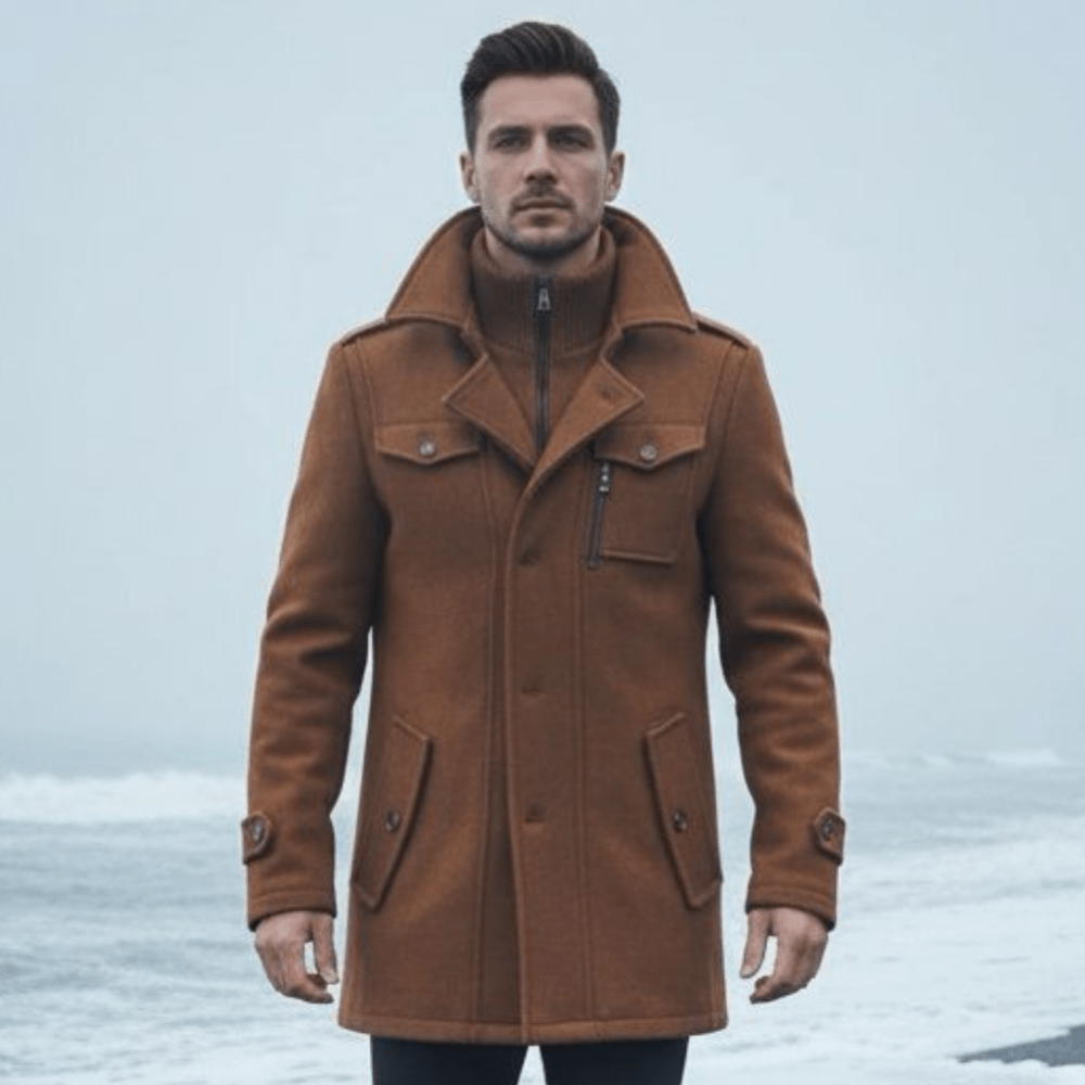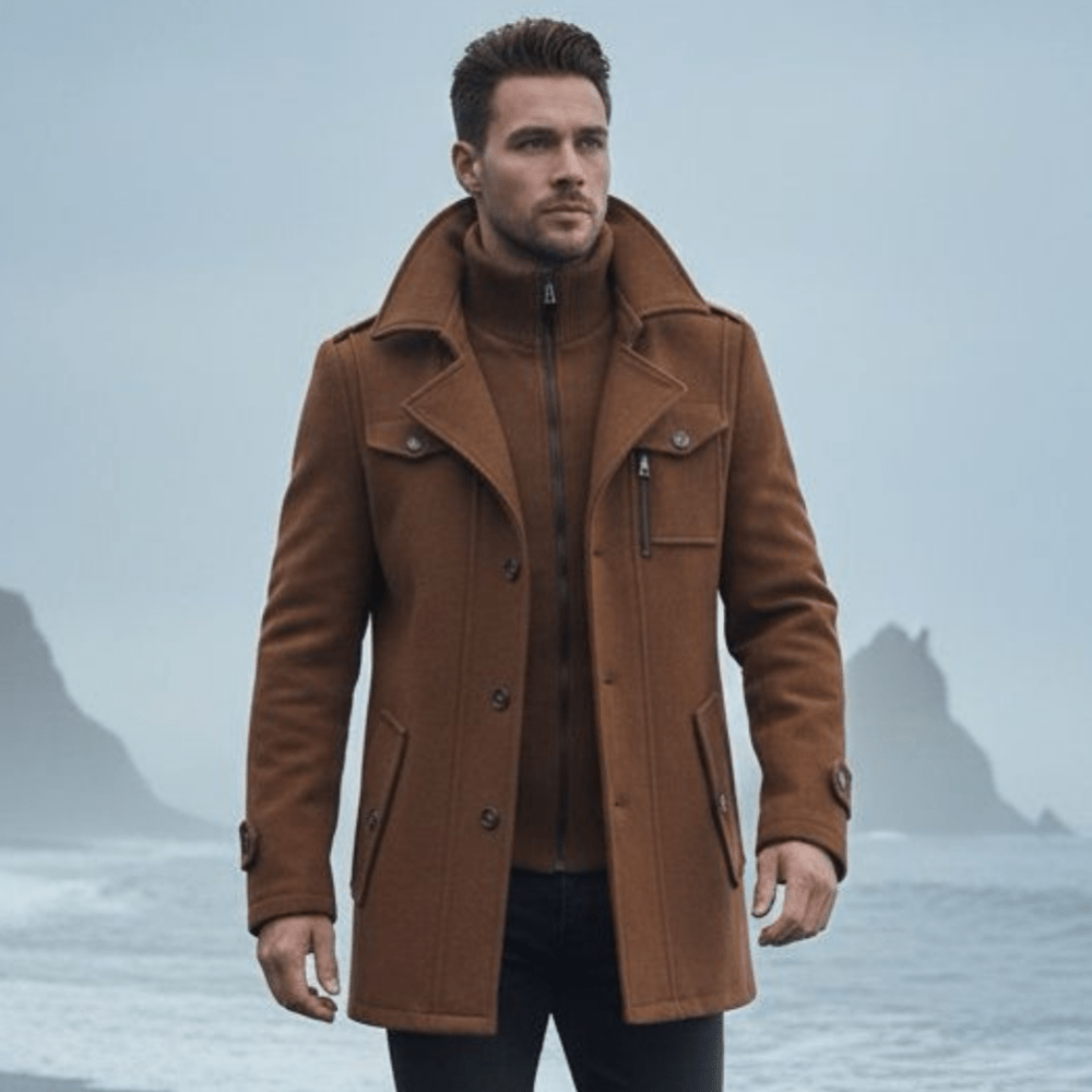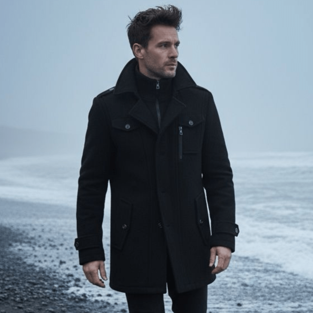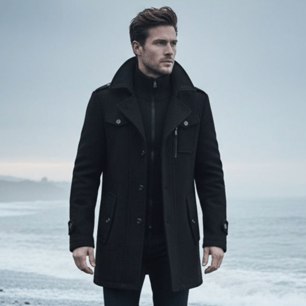 Denne mantelen kombinerer tradisjonelle design med moderne skreddersøm til et mesterverk. Perfekt for menn som ønsker et sofistikert, maskulint utseende som tiltrekker oppmerksomhet hvor enn du går.