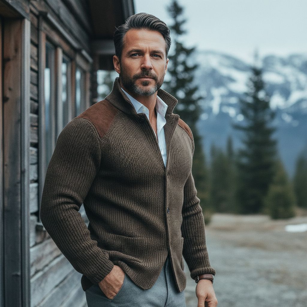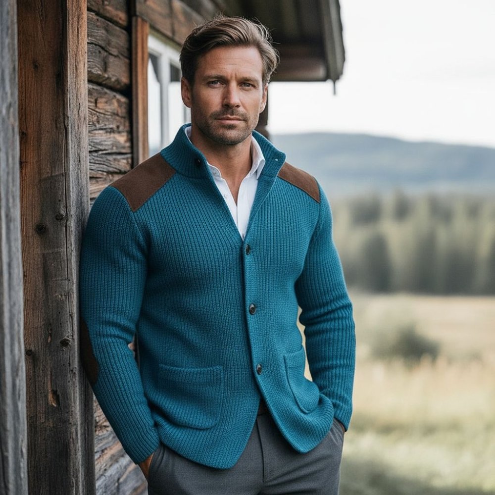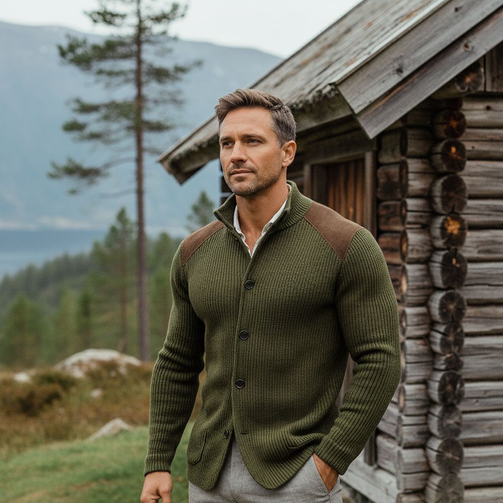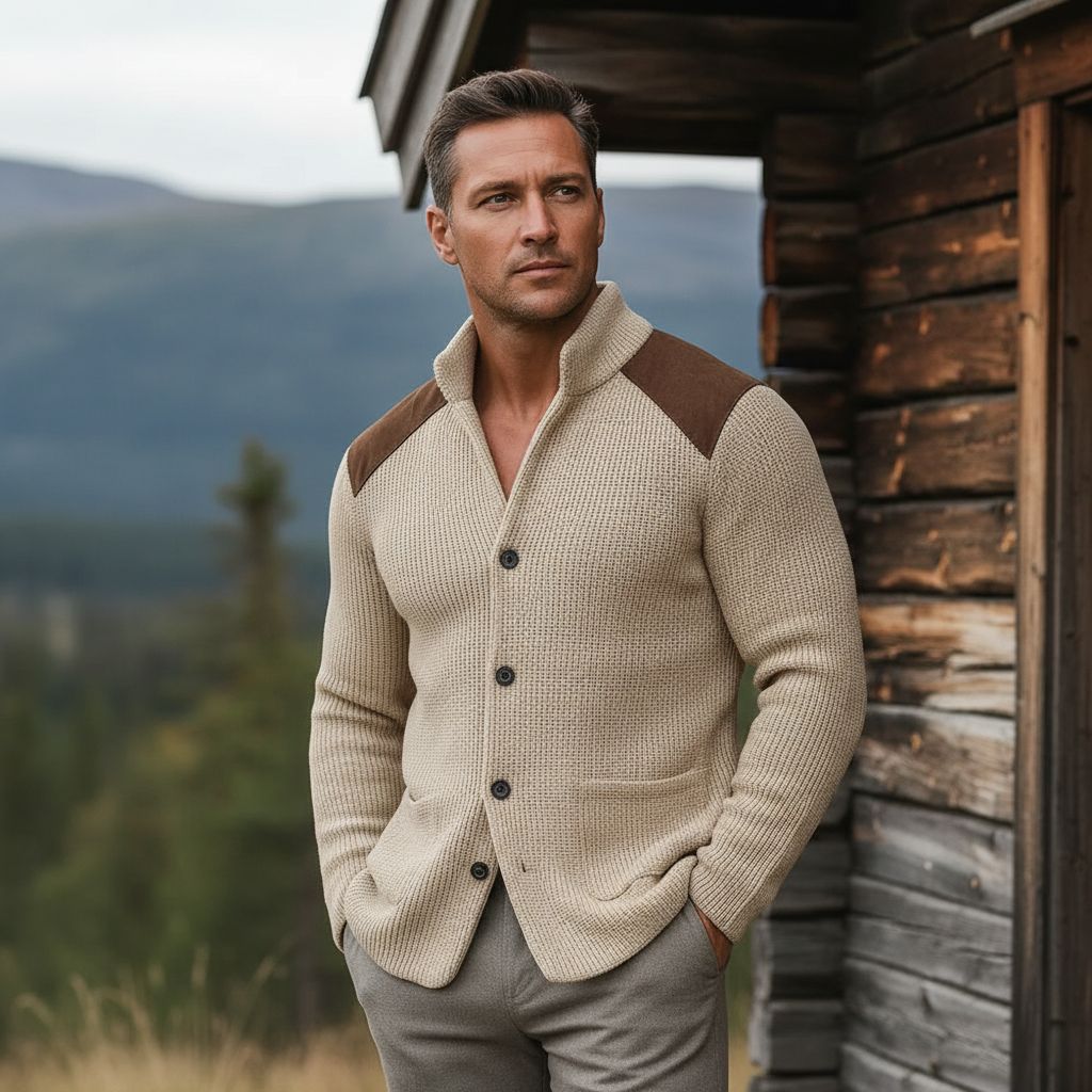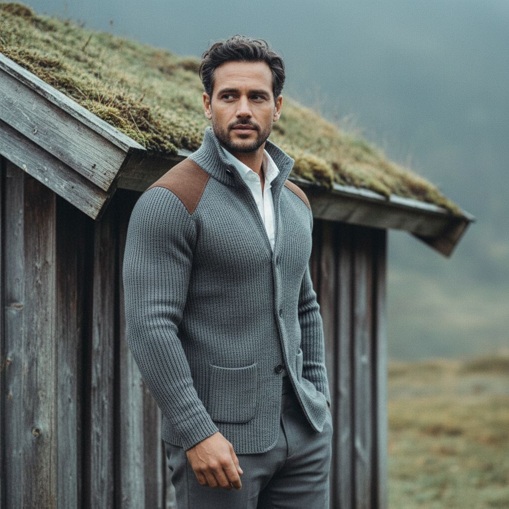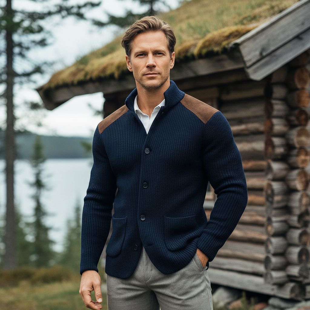 Kombinasjonen av den rike teksturen i stoffet og semsket skinninnlegg gir dybde og karakter. Hver detalj er designet for å skape et sofistikert, allsidig og autentisk maskulint utseende.