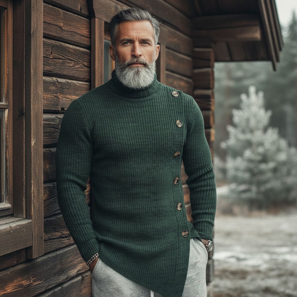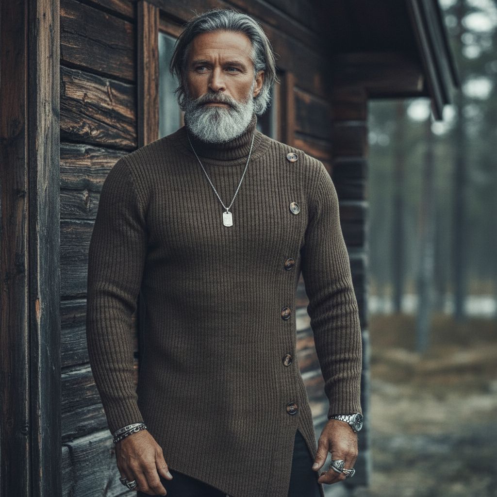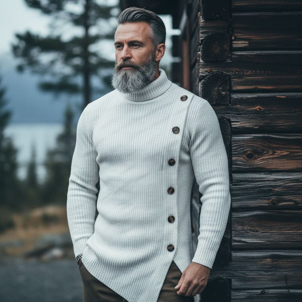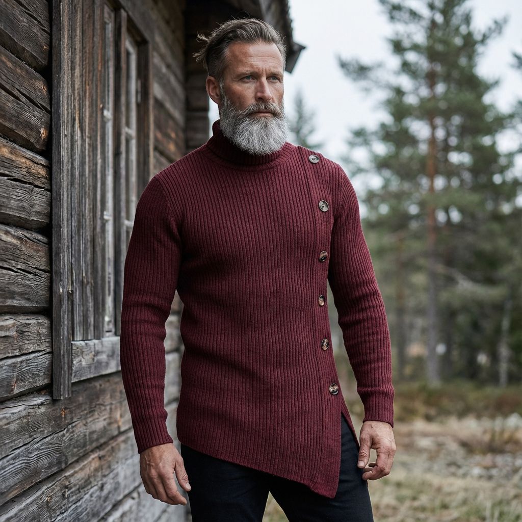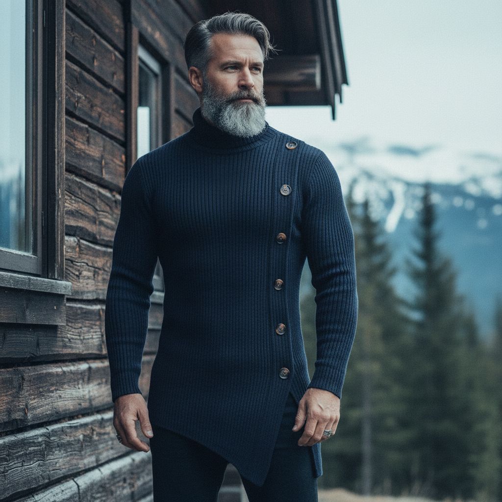Denne premium strikkegenseren er laget for menn som vet hvem de er. Robust, maskulin og tidløs – akkurat som den moderne nordmannen. Den asymmetriske kanten og de dekorative knappene gir et unikt uttrykk uten å gå på kompromiss med komfort.