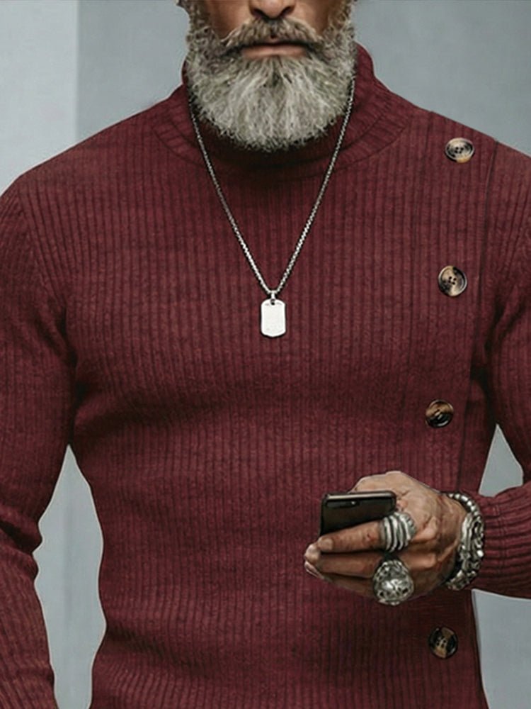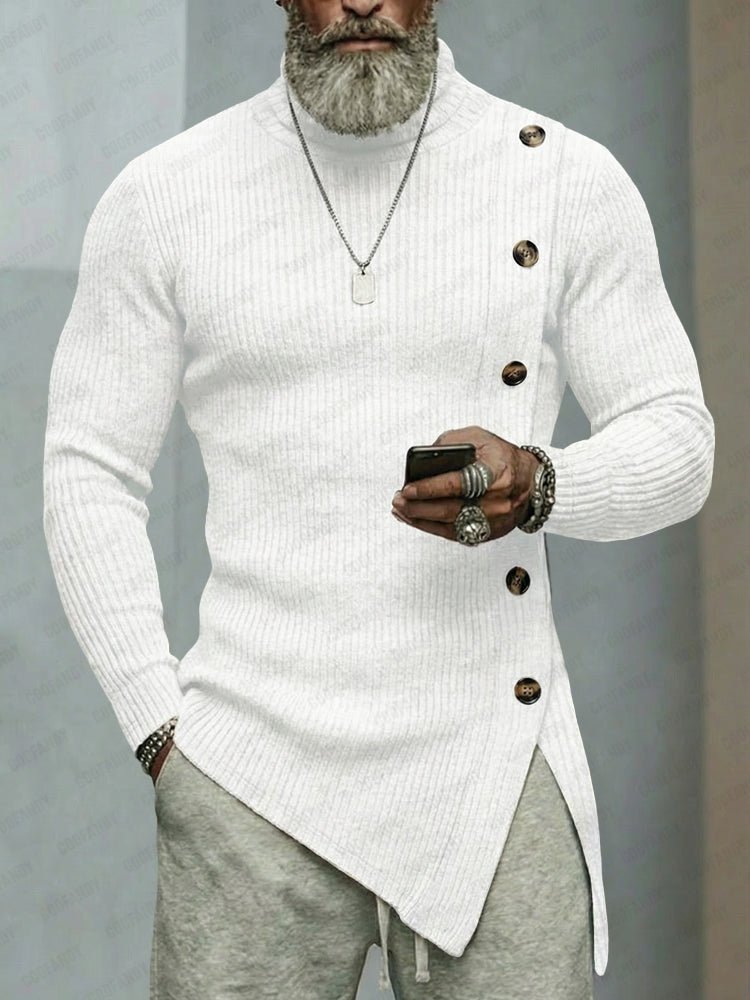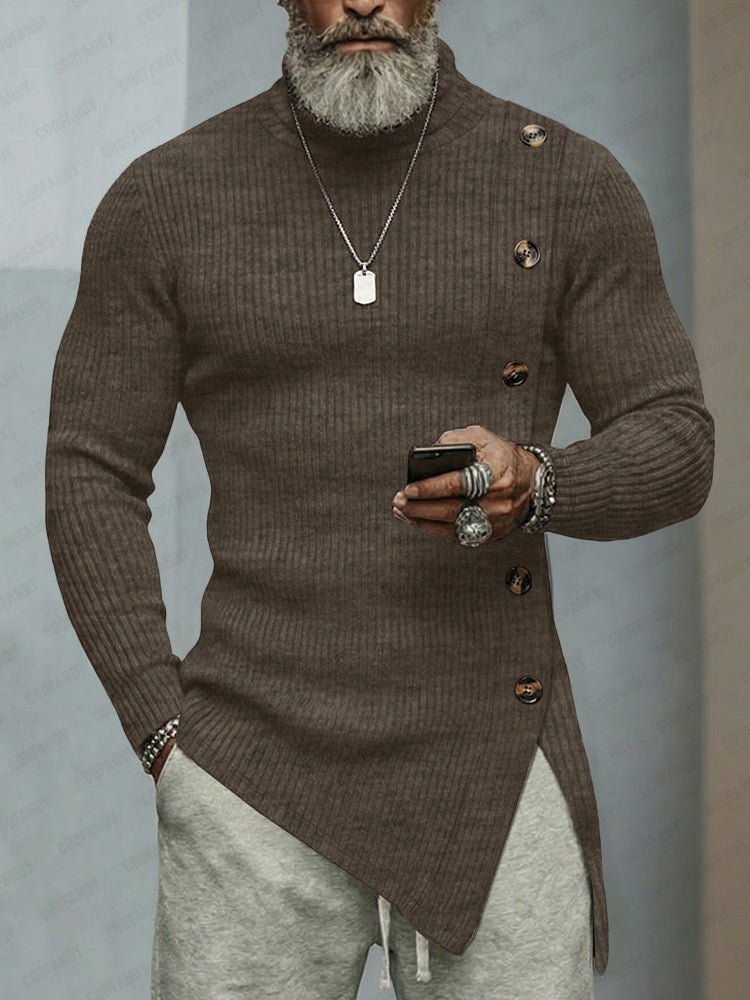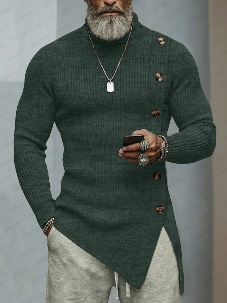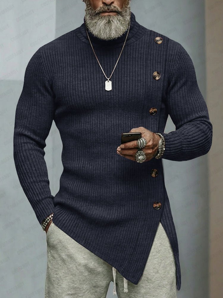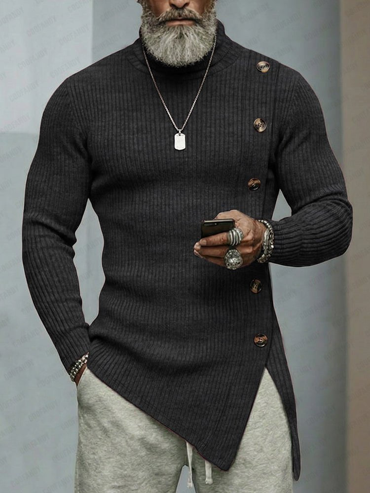 Denne premium strikkegenseren er laget for menn som vet hvem de er. Robust, maskulin og tidløs – akkurat som den moderne nordmannen. Den asymmetriske kanten og de dekorative knappene gir et unikt uttrykk uten å gå på kompromiss med komfort.